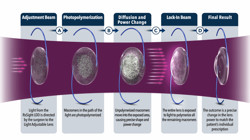 A precise prescription of UV light is delivered the light adjustable lens to adjust and refine the range of vision and astigmatism correction to achieve your desired vision.